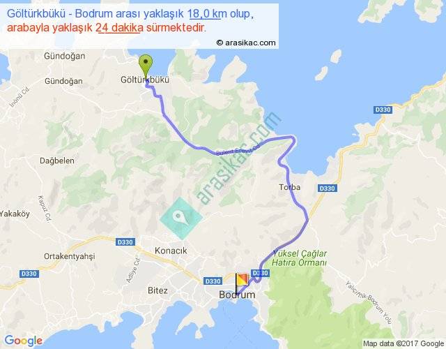 Göltürkbükü - Bodrum arası yaklaşık olarak 90 km/h ile yukarıda belirtilen sürede olup, iki yerin kuş uçuşu uzaklığı (mesafesi) 10'dir. Yolculuk otobüsle 31 dakika sürmektedir.