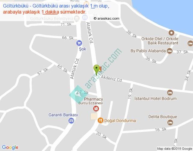 Göltürkbükü - Göltürkbükü arası yaklaşık olarak 90 km/h ile yukarıda belirtilen sürede olup, iki yerin kuş uçuşu uzaklığı (mesafesi) 0'dir. Yolculuk otobüsle 1 dakika sürmektedir.