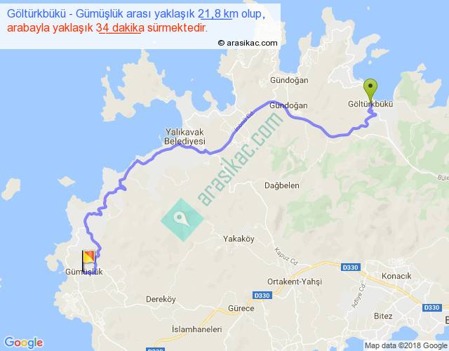 Göltürkbükü - Gümüşlük arası yaklaşık olarak 90 km/h ile yukarıda belirtilen sürede olup, iki yerin kuş uçuşu uzaklığı (mesafesi) 14'dir. Yolculuk otobüsle 44 dakika sürmektedir.