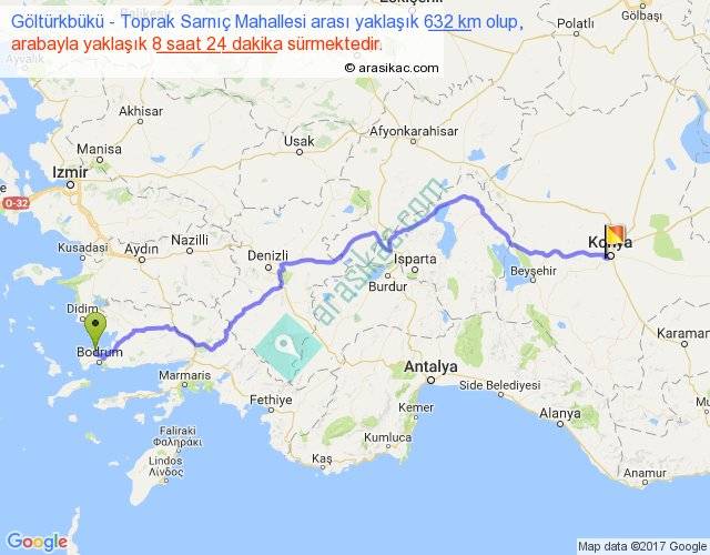 Göltürkbükü - Toprak Sarnıç Mahallesi arası yaklaşık olarak 90 km/h ile yukarıda belirtilen sürede olup, iki yerin kuş uçuşu uzaklığı (mesafesi) 452'dir. Eğer belirtilen yerler arasında uçak seferi var ise bu süre uçakla 41 dakika'ya kadar düşebilir. Yolculuk otobüsle 10 saat 55 dakika sürmektedir.