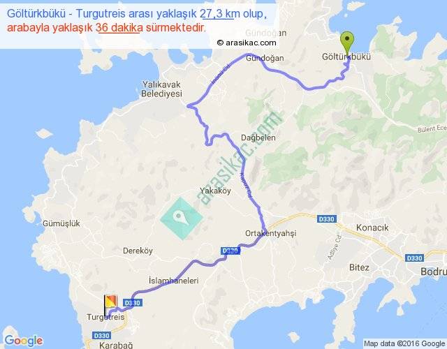 Göltürkbükü - Turgutreis arası yaklaşık olarak 90 km/h ile yukarıda belirtilen sürede olup, iki yerin kuş uçuşu uzaklığı (mesafesi) 15'dir. Yolculuk otobüsle 46 dakika sürmektedir.