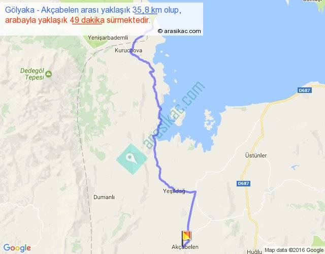 Gölyaka - Akçabelen arası yaklaşık olarak 90 km/h ile yukarıda belirtilen sürede olup, iki yerin kuş uçuşu uzaklığı (mesafesi) 26'dir. Yolculuk otobüsle 1 saat 3 dakika sürmektedir.