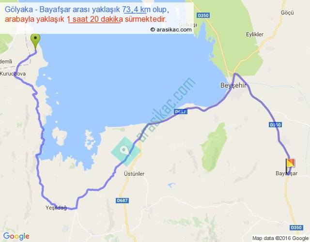 Gölyaka - Bayafşar arası yaklaşık olarak 90 km/h ile yukarıda belirtilen sürede olup, iki yerin kuş uçuşu uzaklığı (mesafesi) 35'dir. Yolculuk otobüsle 1 saat 44 dakika sürmektedir.