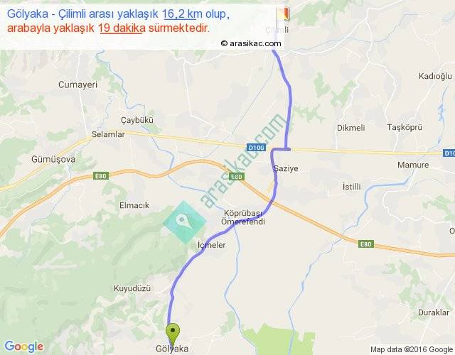 Gölyaka - Çilimli arası yaklaşık olarak 90 km/h ile yukarıda belirtilen sürede olup, iki yerin kuş uçuşu uzaklığı (mesafesi) 14'dir. Yolculuk otobüsle 24 dakika sürmektedir.