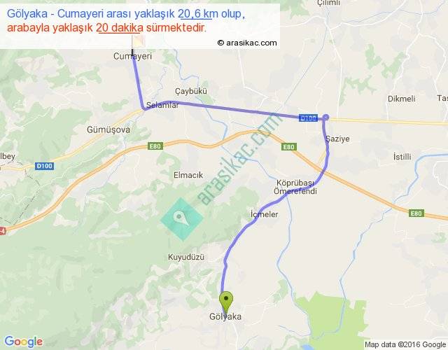 Gölyaka - Cumayeri arası yaklaşık olarak 90 km/h ile yukarıda belirtilen sürede olup, iki yerin kuş uçuşu uzaklığı (mesafesi) 11'dir. Yolculuk otobüsle 26 dakika sürmektedir.
