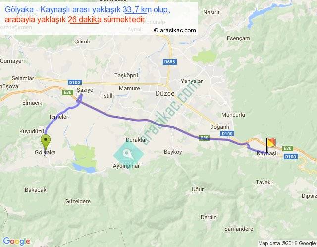 Gölyaka - Kaynaşlı arası yaklaşık olarak 90 km/h ile yukarıda belirtilen sürede olup, iki yerin kuş uçuşu uzaklığı (mesafesi) 26'dir. Yolculuk otobüsle 33 dakika sürmektedir.