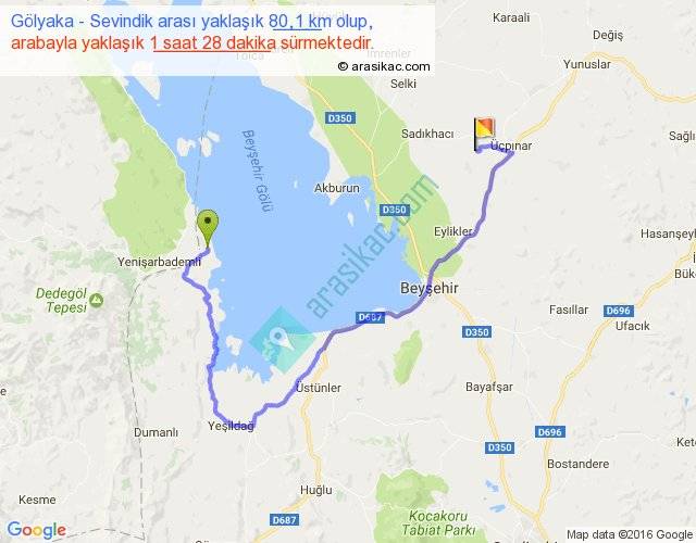 Gölyaka - Sevindik arası yaklaşık olarak 90 km/h ile yukarıda belirtilen sürede olup, iki yerin kuş uçuşu uzaklığı (mesafesi) 32'dir. Yolculuk otobüsle 1 saat 54 dakika sürmektedir.