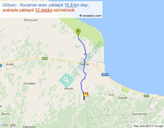 Gölyazı - Kocaman arası yaklaşık olarak 90 km/h ile yukarıda belirtilen sürede olup, iki yerin kuş uçuşu uzaklığı (mesafesi) 14'dir. Yolculuk otobüsle 41 dakika sürmektedir.