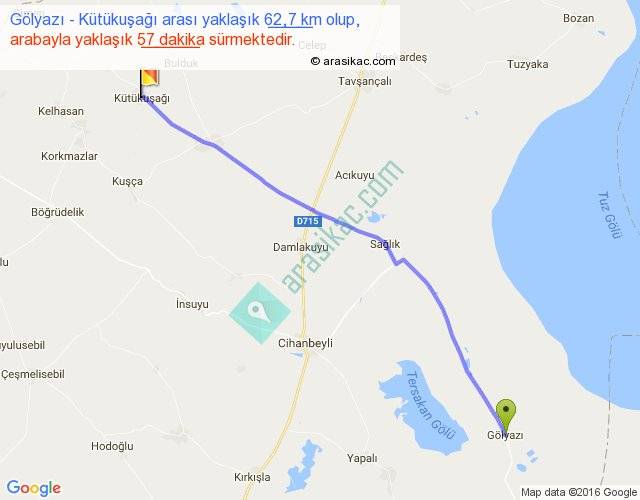 Gölyazı - Kütükuşağı arası yaklaşık olarak 90 km/h ile yukarıda belirtilen sürede olup, iki yerin kuş uçuşu uzaklığı (mesafesi) 59'dir. Yolculuk otobüsle 1 saat 14 dakika sürmektedir.