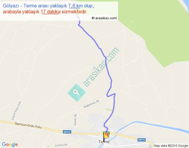 Gölyazı - Terme arası yaklaşık olarak 90 km/h ile yukarıda belirtilen sürede olup, iki yerin kuş uçuşu uzaklığı (mesafesi) 6'dir. Yolculuk otobüsle 22 dakika sürmektedir.