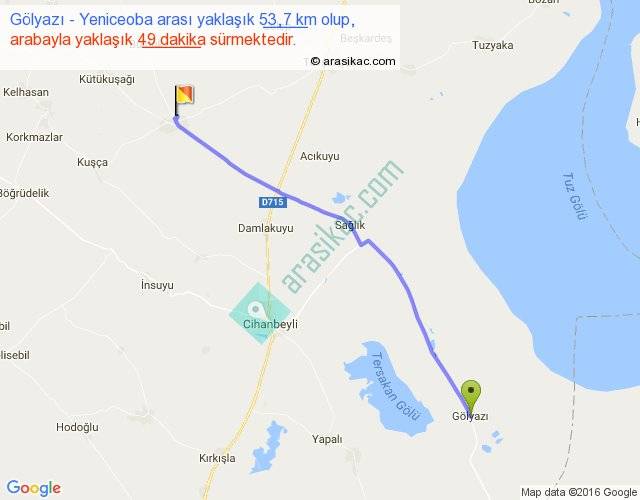 Gölyazı - Yeniceoba arası yaklaşık olarak 90 km/h ile yukarıda belirtilen sürede olup, iki yerin kuş uçuşu uzaklığı (mesafesi) 50'dir. Yolculuk otobüsle 1 saat 3 dakika sürmektedir.