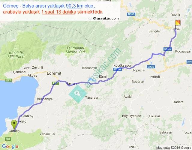Gömeç - Balya arası yaklaşık olarak 90 km/h ile yukarıda belirtilen sürede olup, iki yerin kuş uçuşu uzaklığı (mesafesi) 74'dir. Yolculuk otobüsle 1 saat 36 dakika sürmektedir.