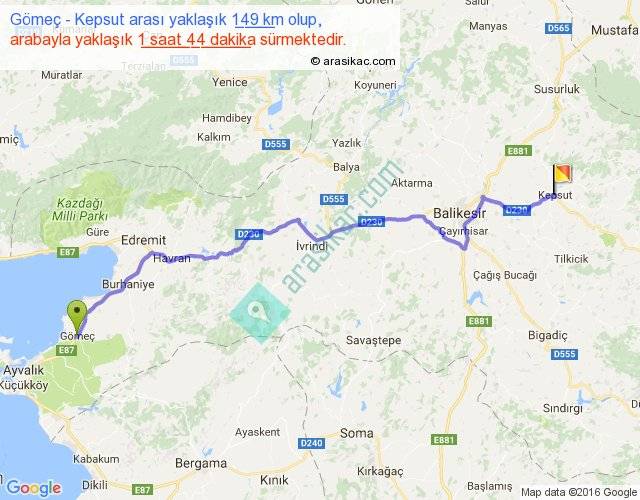 Gömeç - Kepsut arası yaklaşık olarak 90 km/h ile yukarıda belirtilen sürede olup, iki yerin kuş uçuşu uzaklığı (mesafesi) 117'dir. Yolculuk otobüsle 2 saat 15 dakika sürmektedir.