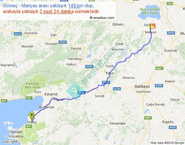 Gömeç - Manyas arası yaklaşık olarak 90 km/h ile yukarıda belirtilen sürede olup, iki yerin kuş uçuşu uzaklığı (mesafesi) 120'dir. Yolculuk otobüsle 3 saat 7 dakika sürmektedir.