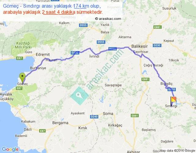 Gömeç - Sındırgı arası yaklaşık olarak 90 km/h ile yukarıda belirtilen sürede olup, iki yerin kuş uçuşu uzaklığı (mesafesi) 115'dir. Yolculuk otobüsle 2 saat 41 dakika sürmektedir.