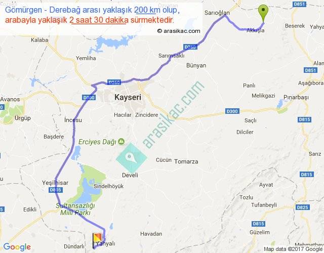 Gömürgen - Derebağ arası yaklaşık olarak 90 km/h ile yukarıda belirtilen sürede olup, iki yerin kuş uçuşu uzaklığı (mesafesi) 132'dir. Yolculuk otobüsle 3 saat 15 dakika sürmektedir.