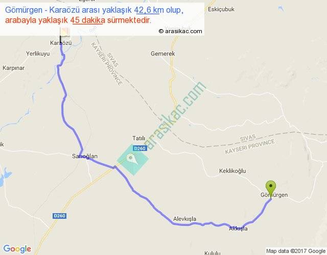 Gömürgen - Karaözü arası yaklaşık olarak 90 km/h ile yukarıda belirtilen sürede olup, iki yerin kuş uçuşu uzaklığı (mesafesi) 30'dir. Yolculuk otobüsle 58 dakika sürmektedir.