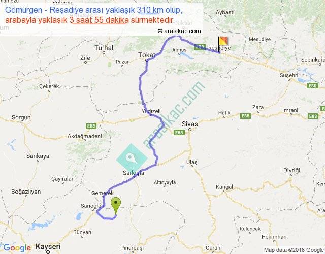 Gömürgen - Reşadiye arası yaklaşık olarak 90 km/h ile yukarıda belirtilen sürede olup, iki yerin kuş uçuşu uzaklığı (mesafesi) 178'dir. Yolculuk otobüsle 5 saat 5 dakika sürmektedir.
