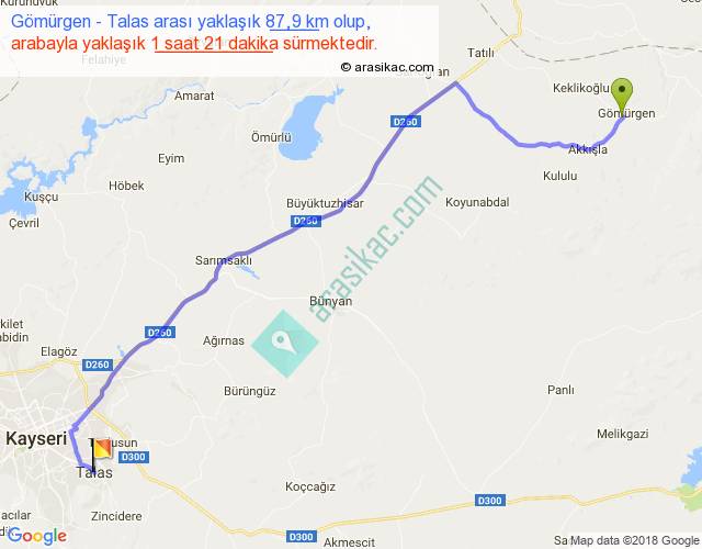 Gömürgen - Talas arası yaklaşık olarak 90 km/h ile yukarıda belirtilen sürede olup, iki yerin kuş uçuşu uzaklığı (mesafesi) 69'dir. Yolculuk otobüsle 1 saat 45 dakika sürmektedir.