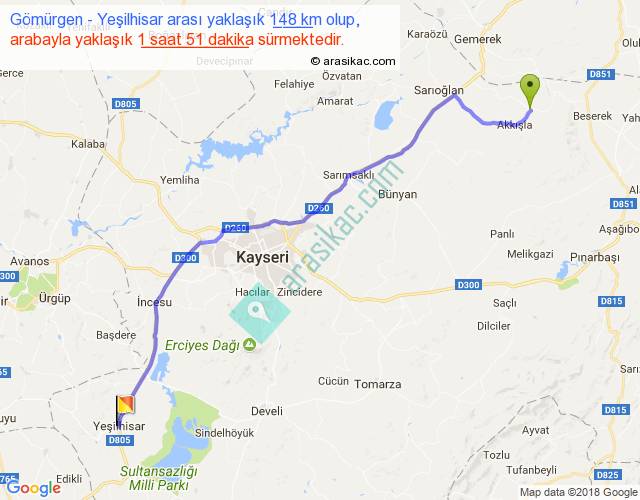 Gömürgen - Yeşilhisar arası yaklaşık olarak 90 km/h ile yukarıda belirtilen sürede olup, iki yerin kuş uçuşu uzaklığı (mesafesi) 123'dir. Yolculuk otobüsle 2 saat 24 dakika sürmektedir.