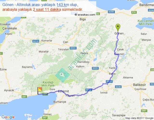 Gönen - Altinoluk arası yaklaşık olarak 90 km/h ile yukarıda belirtilen sürede olup, iki yerin kuş uçuşu uzaklığı (mesafesi) 98'dir. Yolculuk otobüsle 2 saat 50 dakika sürmektedir.