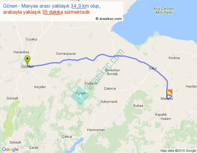 Gönen - Manyas arası yaklaşık olarak 90 km/h ile yukarıda belirtilen sürede olup, iki yerin kuş uçuşu uzaklığı (mesafesi) 27'dir. Yolculuk otobüsle 45 dakika sürmektedir.