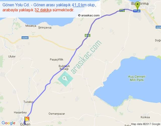 Gönen Yolu Cd. - Gönen arası yaklaşık olarak 90 km/h ile yukarıda belirtilen sürede olup, iki yerin kuş uçuşu uzaklığı (mesafesi) 37'dir. Yolculuk otobüsle 41 dakika sürmektedir.