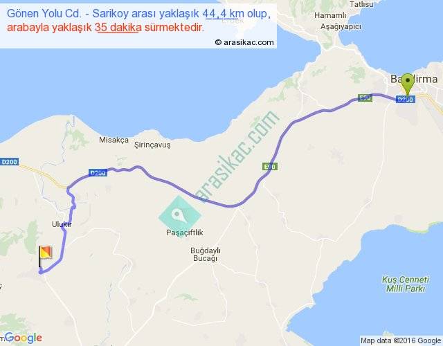 Gönen Yolu Cd. - Sarikoy arası yaklaşık olarak 90 km/h ile yukarıda belirtilen sürede olup, iki yerin kuş uçuşu uzaklığı (mesafesi) 34'dir. Yolculuk otobüsle 45 dakika sürmektedir.
