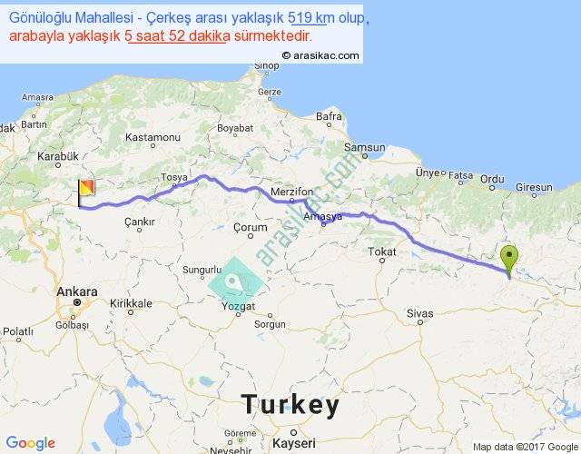 Gönüloğlu Mahallesi - Çerkeş arası yaklaşık olarak 90 km/h ile yukarıda belirtilen sürede olup, iki yerin kuş uçuşu uzaklığı (mesafesi) 443'dir. Eğer belirtilen yerler arasında uçak seferi var ise bu süre uçakla 40 dakika'ya kadar düşebilir. Yolculuk otobüsle 7 saat 37 dakika sürmektedir.