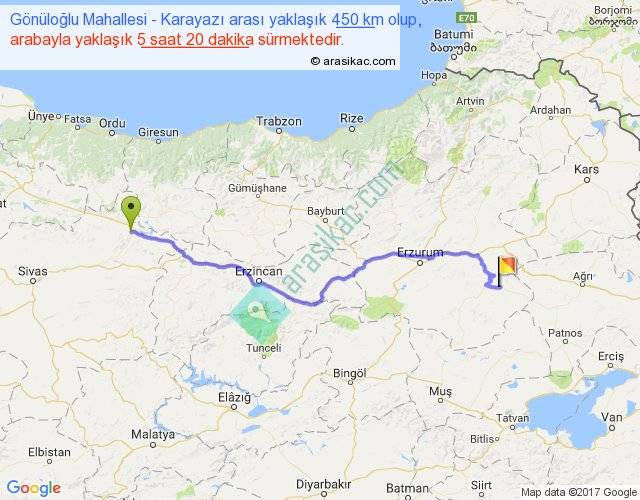Gönüloğlu Mahallesi - Karayazı arası yaklaşık olarak 90 km/h ile yukarıda belirtilen sürede olup, iki yerin kuş uçuşu uzaklığı (mesafesi) 348'dir. Eğer belirtilen yerler arasında uçak seferi var ise bu süre uçakla 32 dakika'ya kadar düşebilir. Yolculuk otobüsle 6 saat 56 dakika sürmektedir.
