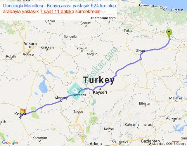 Gönüloğlu Mahallesi - Konya arası yaklaşık olarak 90 km/h ile yukarıda belirtilen sürede olup, iki yerin kuş uçuşu uzaklığı (mesafesi) 543'dir. Eğer belirtilen yerler arasında uçak seferi var ise bu süre uçakla 50 dakika'ya kadar düşebilir. Yolculuk otobüsle 9 saat 20 dakika sürmektedir.