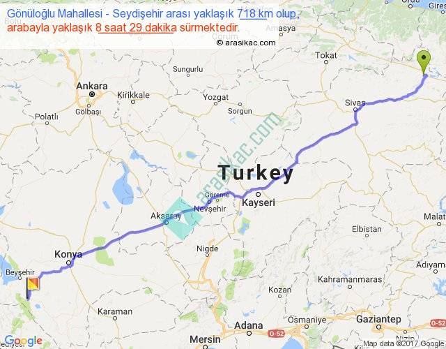 Gönüloğlu Mahallesi - Seydişehir arası yaklaşık olarak 90 km/h ile yukarıda belirtilen sürede olup, iki yerin kuş uçuşu uzaklığı (mesafesi) 617'dir. Eğer belirtilen yerler arasında uçak seferi var ise bu süre uçakla 56 dakika'ya kadar düşebilir. Yolculuk otobüsle 11 saat 1 dakika sürmektedir.