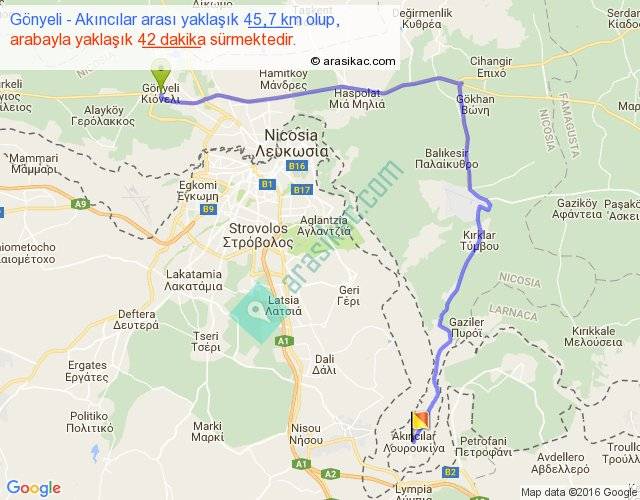 Gönyeli - Akıncılar arası yaklaşık olarak 90 km/h ile yukarıda belirtilen sürede olup, iki yerin kuş uçuşu uzaklığı (mesafesi) 27'dir. Yolculuk otobüsle 54 dakika sürmektedir.