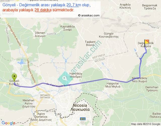 Gönyeli - Değirmenlik arası yaklaşık olarak 90 km/h ile yukarıda belirtilen sürede olup, iki yerin kuş uçuşu uzaklığı (mesafesi) 17'dir. Yolculuk otobüsle 36 dakika sürmektedir.