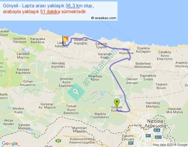 Gönyeli - Lapta arası yaklaşık olarak 90 km/h ile yukarıda belirtilen sürede olup, iki yerin kuş uçuşu uzaklığı (mesafesi) 18'dir. Yolculuk otobüsle 1 saat 6 dakika sürmektedir.