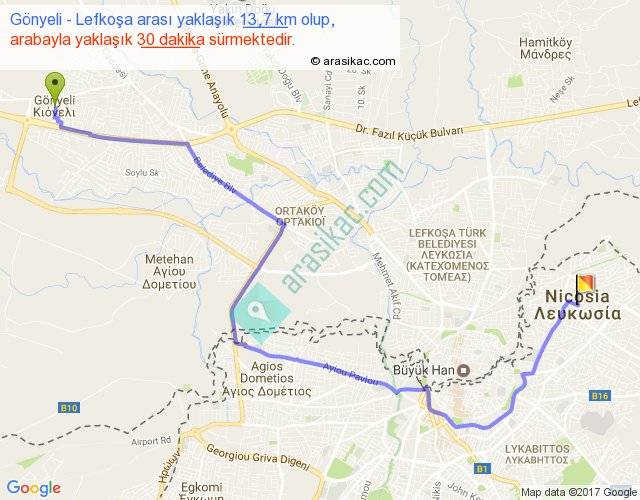 Gönyeli - Lefkoşa arası yaklaşık olarak 90 km/h ile yukarıda belirtilen sürede olup, iki yerin kuş uçuşu uzaklığı (mesafesi) 9'dir. Yolculuk otobüsle 39 dakika sürmektedir.