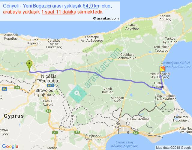 Gönyeli - Yeni Boğaziçi arası yaklaşık olarak 90 km/h ile yukarıda belirtilen sürede olup, iki yerin kuş uçuşu uzaklığı (mesafesi) 54'dir. Yolculuk otobüsle 1 saat 32 dakika sürmektedir.