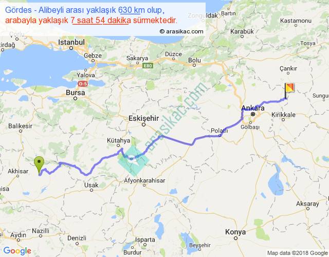 Gördes - Alibeyli arası yaklaşık olarak 90 km/h ile yukarıda belirtilen sürede olup, iki yerin kuş uçuşu uzaklığı (mesafesi) 471'dir. Eğer belirtilen yerler arasında uçak seferi var ise bu süre uçakla 43 dakika'ya kadar düşebilir. Yolculuk otobüsle 10 saat 16 dakika sürmektedir.