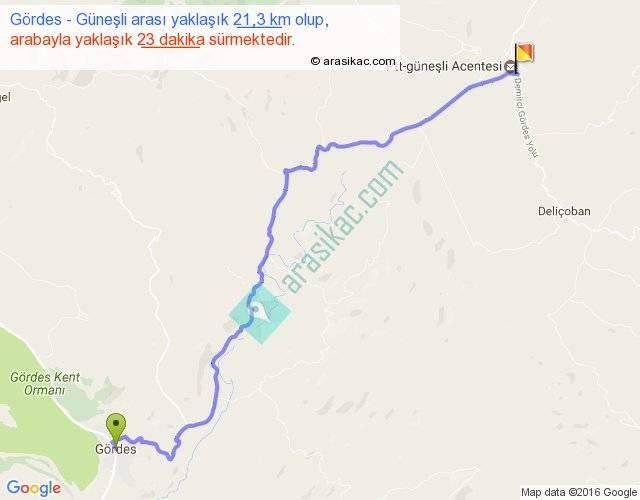 Gördes - Güneşli arası yaklaşık olarak 90 km/h ile yukarıda belirtilen sürede olup, iki yerin kuş uçuşu uzaklığı (mesafesi) 16'dir. Yolculuk otobüsle 29 dakika sürmektedir.