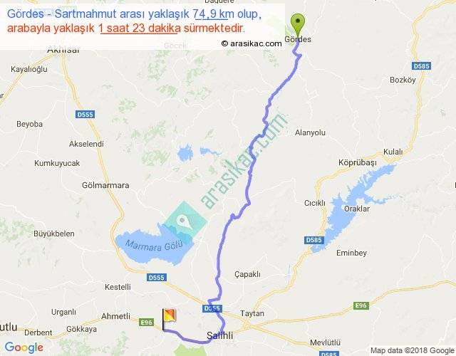 Gördes - Sartmahmut arası yaklaşık olarak 90 km/h ile yukarıda belirtilen sürede olup, iki yerin kuş uçuşu uzaklığı (mesafesi) 53'dir. Yolculuk otobüsle 1 saat 47 dakika sürmektedir.