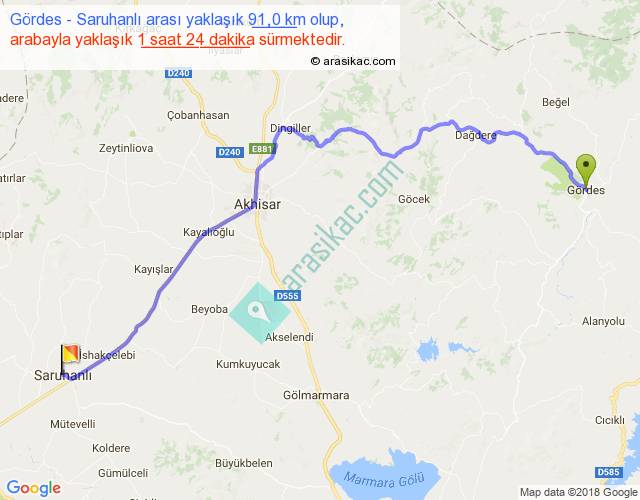 Gördes - Saruhanlı arası yaklaşık olarak 90 km/h ile yukarıda belirtilen sürede olup, iki yerin kuş uçuşu uzaklığı (mesafesi) 66'dir. Yolculuk otobüsle 1 saat 49 dakika sürmektedir.