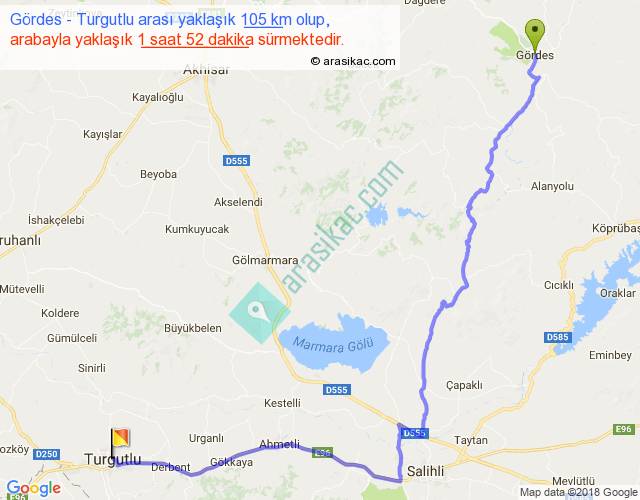 Gördes - Turgutlu arası yaklaşık olarak 90 km/h ile yukarıda belirtilen sürede olup, iki yerin kuş uçuşu uzaklığı (mesafesi) 69'dir. Yolculuk otobüsle 2 saat 25 dakika sürmektedir.