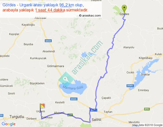 Gördes - Urganlı arası yaklaşık olarak 90 km/h ile yukarıda belirtilen sürede olup, iki yerin kuş uçuşu uzaklığı (mesafesi) 60'dir. Yolculuk otobüsle 2 saat 15 dakika sürmektedir.