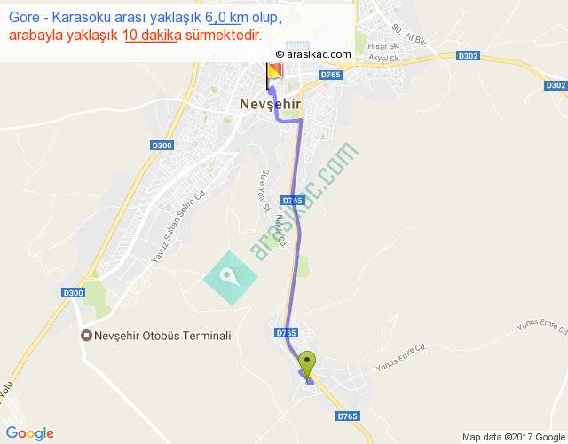 Göre - Karasoku arası yaklaşık olarak 90 km/h ile yukarıda belirtilen sürede olup, iki yerin kuş uçuşu uzaklığı (mesafesi) 5'dir. Yolculuk otobüsle 13 dakika sürmektedir.