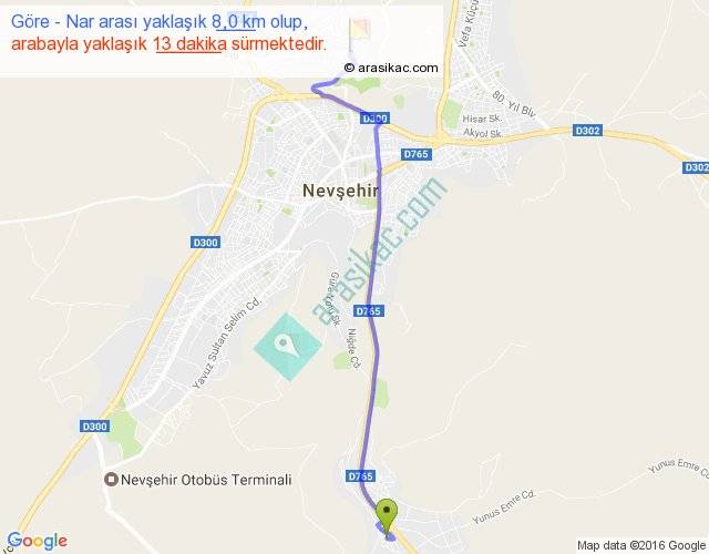Göre - Nar arası yaklaşık olarak 90 km/h ile yukarıda belirtilen sürede olup, iki yerin kuş uçuşu uzaklığı (mesafesi) 7'dir. Yolculuk otobüsle 16 dakika sürmektedir.