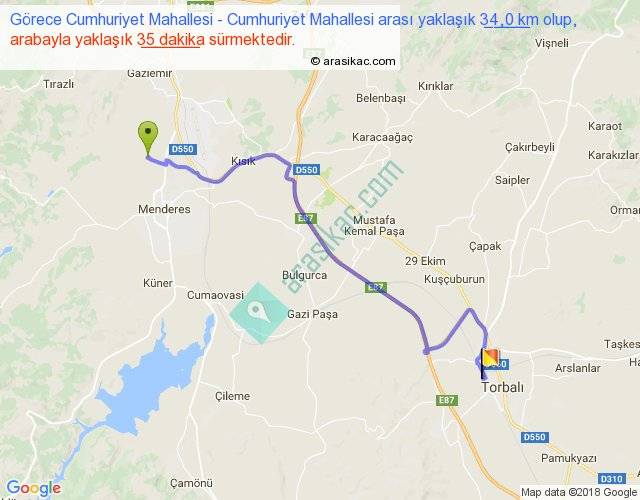 Görece Cumhuriyet Mahallesi - Cumhuriyet Mahallesi arası yaklaşık olarak 90 km/h ile yukarıda belirtilen sürede olup, iki yerin kuş uçuşu uzaklığı (mesafesi) 24'dir. Yolculuk otobüsle 45 dakika sürmektedir.