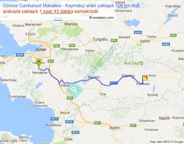 Görece Cumhuriyet Mahallesi - Kaymakçi arası yaklaşık olarak 90 km/h ile yukarıda belirtilen sürede olup, iki yerin kuş uçuşu uzaklığı (mesafesi) 87'dir. Yolculuk otobüsle 2 saat 13 dakika sürmektedir.