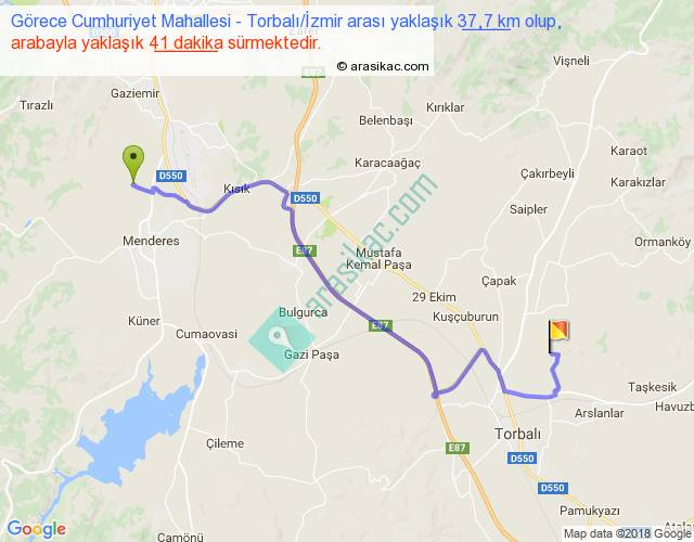 Görece Cumhuriyet Mahallesi - Torbalı İzmir arası yaklaşık olarak 90 km/h ile yukarıda belirtilen sürede olup, iki yerin kuş uçuşu uzaklığı (mesafesi) 25'dir. Yolculuk otobüsle 53 dakika sürmektedir.