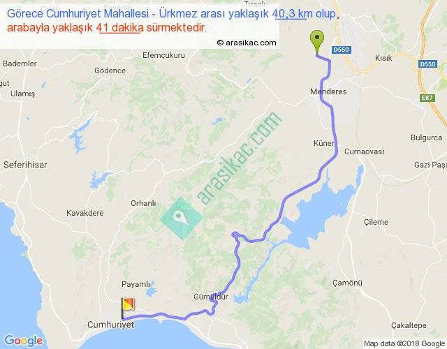 Görece Cumhuriyet Mahallesi - Ürkmez arası yaklaşık olarak 90 km/h ile yukarıda belirtilen sürede olup, iki yerin kuş uçuşu uzaklığı (mesafesi) 28'dir. Yolculuk otobüsle 53 dakika sürmektedir.