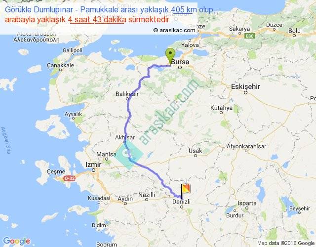 Görükle Dumlupınar - Pamukkale arası yaklaşık olarak 90 km/h ile yukarıda belirtilen sürede olup, iki yerin kuş uçuşu uzaklığı (mesafesi) 256'dir. Eğer belirtilen yerler arasında uçak seferi var ise bu süre uçakla 23 dakika'ya kadar düşebilir. Yolculuk otobüsle 6 saat 7 dakika sürmektedir.